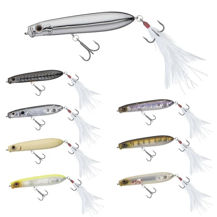 Its unique bill produces powerful splatter, spit and bubbles that appeal to the fish. A body designed for air-resistance reduction, and tungsten weights at the very end of its tail guarantee incredible distance even against head winds. It can now search a much wider area with just one cast. Excellent body balance allows it to make quick consecutive turns without jumping out of the water, making it move much like agitated bait fish chased by a bass. The bait readily triggers the fish to bite. The feather hooks attached to the tail serve as “resonance” in the intervals between stillness and motion of an action, take those light bites of a fish unable to break above water into full-on bites, and help support the hook’s suction. On the other hand, the resistance created by the feather hooks has the effect of producing more sharpness to the bait’s quick turns.