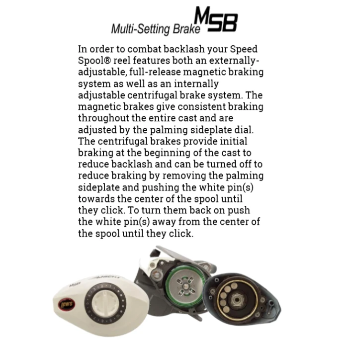 - Externally adjustable Multi-Setting Brake (MSB) dual cast control system utilizes both an external click-dial for setting the magnetic brake, plus 4 individually disengaging, disc-mounted internal brake shoes that operate centrifugally