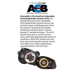 - Externally adjustable 6-pin 27 position QuietCast Adjustable Centrifugal Braking system (ACB)
