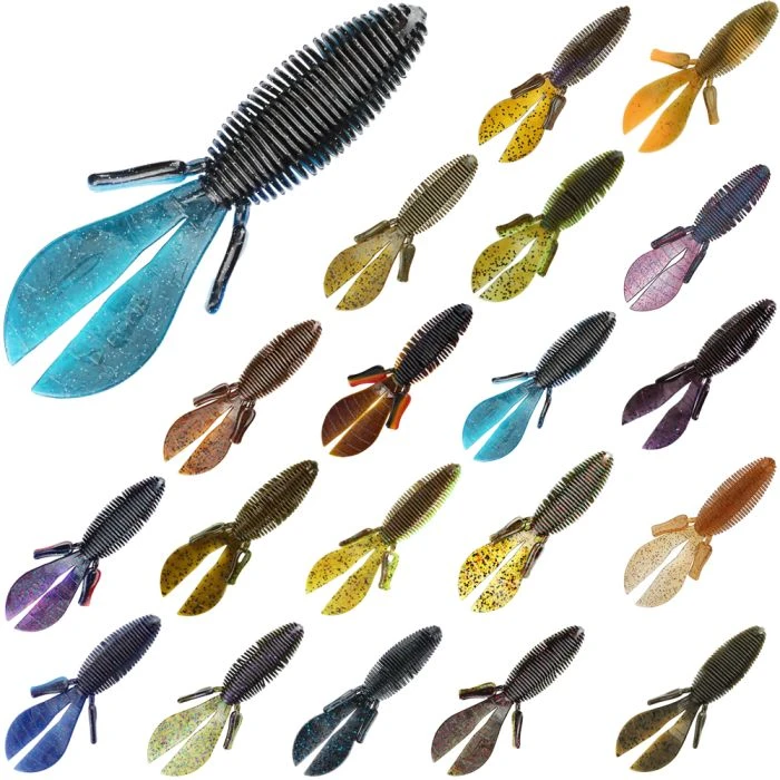 Pitching and flipping has a new go-to bait. D Bomb is a bulky 4 ” creature bait with a unique ribbed body that displaces lots of water resulting in a straight fall. The tails sail when left connected or flap wildly when separated. The body is thinner where the hook comes out for easy hook sets but has a thicker head so the bait stays on the hook.